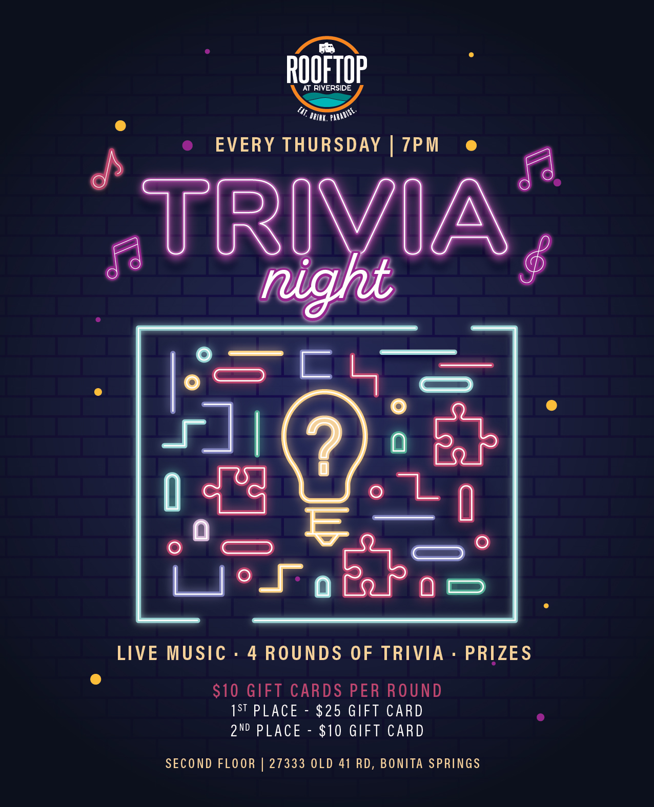 Join us for Trivia Night at Rooftop at Riverside every Thursday starting at 7pm upstairs! Test your knowledge and win awesome prizes. Here's what you can look forward to: 4 rounds - $10 gift cards per round! Prizes 1st place overall - $25 gift card 2nd place overall - $10 gift card Get ready for a night of fun and friendly competition!